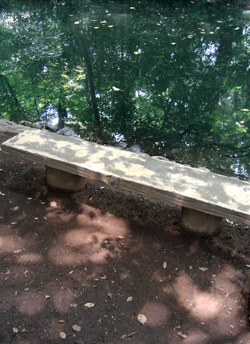 a short rest at the bench along the edge of the silent pond in the forest...