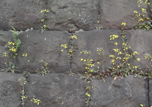 small yellow flowers on the stone wall