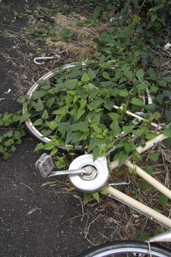 on the thrown away bicycle...